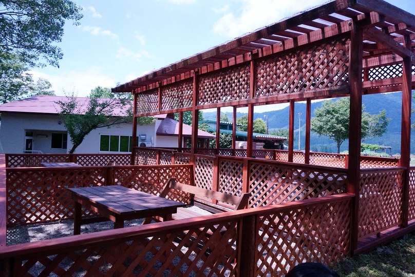 ▽屋根あり部分はBBQ用、屋根なし部分がドッグカフェ用